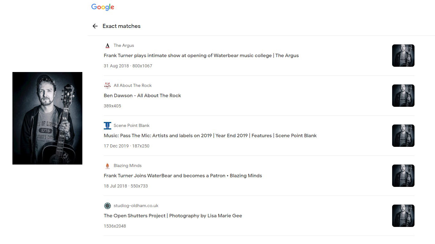 For example, a portrait I took of rock star Frank Turner a few years ago, has been used by his management (with my permission) on several occasions. A quick reverse image search using Google Lens brings up several instances. Those are all authorised uses, but if they weren’t, it would be simple for me to track them down and invoice them.