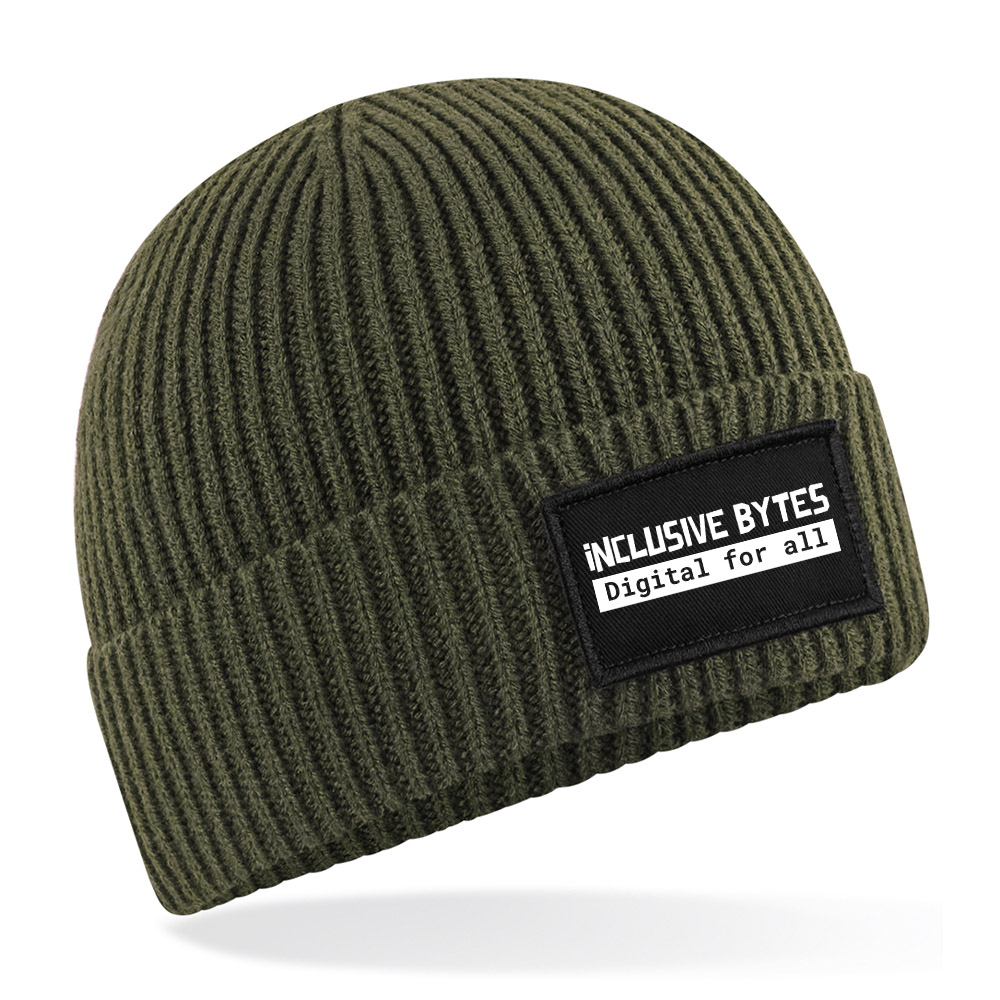 Fashionable beanie in military green with a ribbed single layer knit, cuffed design and a black cotton twill patch with the Inclusive Bytes logo.